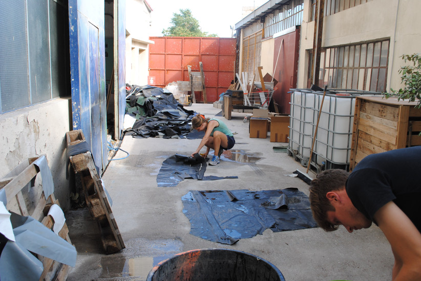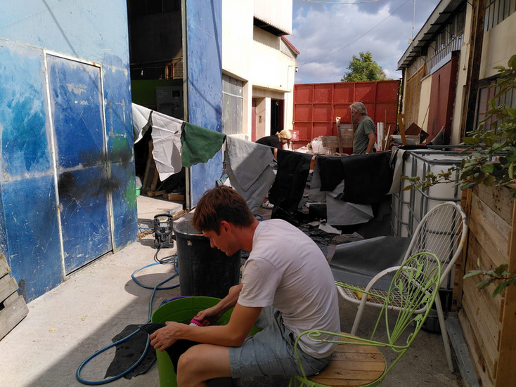 In our tailoring lab, this philosophy comes to life. It looks like carrying heavy rolls of PVC and banners together across our space, washing each sheet carefully before it can be cut, and placing patterns deliberately to avoid leaving waste behind. It means accepting that no two pieces will ever be identical, and choosing not to hide the “imperfections”.